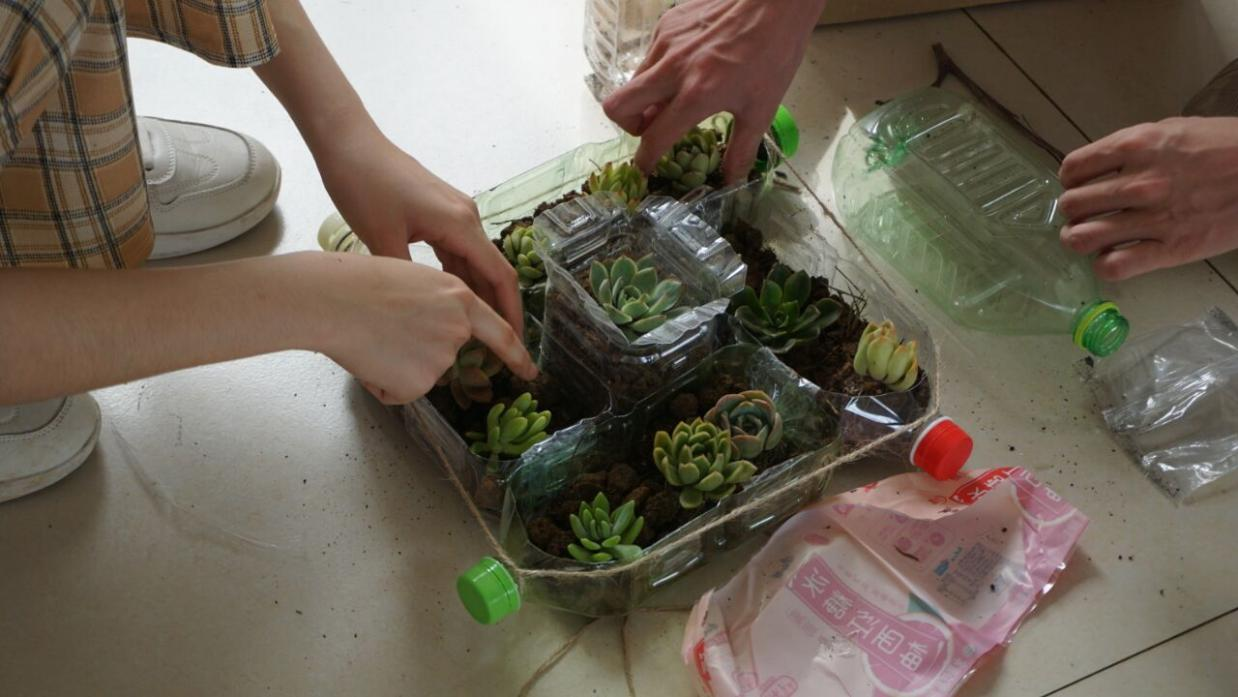 活动中,各班参赛人员于各班设计区域制作盆栽设计,用剪刀等工具对塑料瓶进行剪裁和塑形,使其呈现出独特的形状和风格,将准备好的多肉植物和土壤填充到设计好的盆栽里,固定其根部,调整植物的位置和角度,使其看起来更加美观和协调。整个设计过程既充满了挑战又充满了乐趣,让同学们在动手制作中体验到园艺的乐趣和成就感。