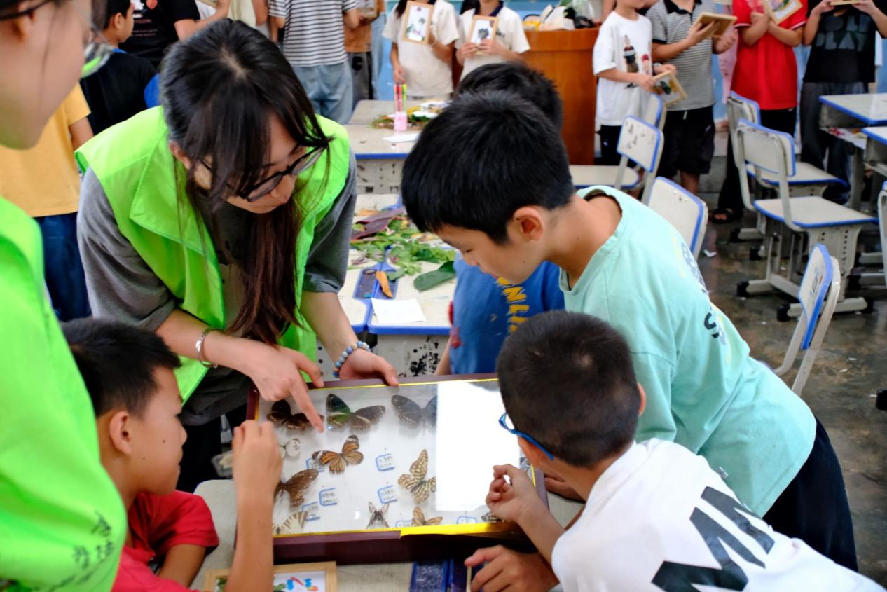 “植物标本的制作”课堂上,实践团成员们将小朋友们进行分组,给每个小组发放了形状、颜色各异的植物叶片,让大家开动想象力,DIY不同的植物标本,完成裱框,并邀请小朋友们上台展示自己创作的作品。成员们还发给小朋友们透明书签袋、干花等材料用于制作压花书签。此外,成员们给小朋友们展示了青蛙、兔子等骨骼标本和各种昆虫标本,为他们展示了一个新奇的生物世界。小朋友们都兴趣盎然,对各类动植物有了更直观的感受和体验,深刻感受到了大自然的神奇和多元。