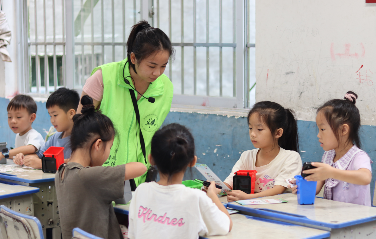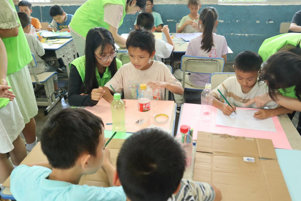 “环保工艺品手工制作”小课堂上,成员们教小朋友们利用塑料瓶、废纸皮等材料进行手工制作,将原本可能成为垃圾的物品变成了有用的艺术品。小朋友们在这个过程中,不仅开发了想象力,锻炼了动手能力和创造力,更让他们深刻体会到了“变废为宝”的乐趣和意义,树立了生态环保、循环利用的意识。