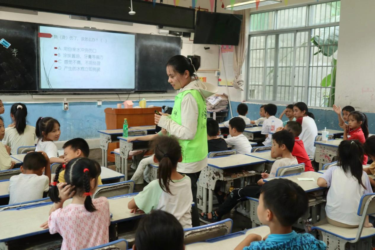 “安全急救,从我做起”课堂上,实践团成员向小朋友们讲解了溺水、火灾、地震的急救知识,通过趣味问答,让小朋友们学习和掌握一些急救知识和技能,在真正遇到突发情况时合理地实施自救和救护他人,营造“人人学急救、急救为人人”的良好氛围。
