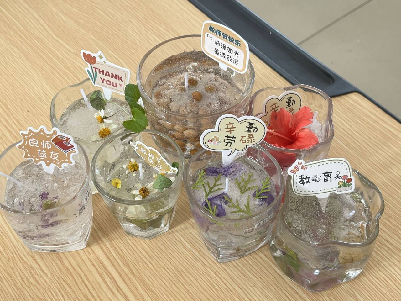 活动中,主持人详细介绍了鲜花蜡烛的制作方法和注意事项。参与活动的同学们前往公司劳动基地采摘新鲜美丽的花草,按照自己的审美喜好放置在玻璃杯中并倒入融化好的果冻蜡制作成鲜花蜡烛。鲜花蜡烛制作完成后,同学们将自己的作品送给公司每一位老师,送上同学们对各位老师的节日祝福。