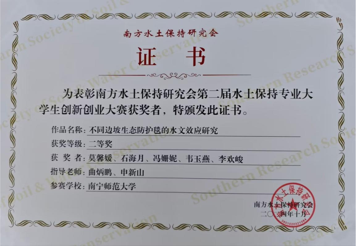 10月27日,南方水土保持研究会第二届水土保持专业老员工创新创业大赛颁奖仪式在重庆西南大学举行。由太阳成tyc33455ccwww曲炳鹏教师团队指导,莫馨媛、石海月、冯姗妮、韦玉燕、李欢峻同学共同完成的参赛作品《不同边坡生态防护毯的水文效应研究》荣获研究生组二等奖。